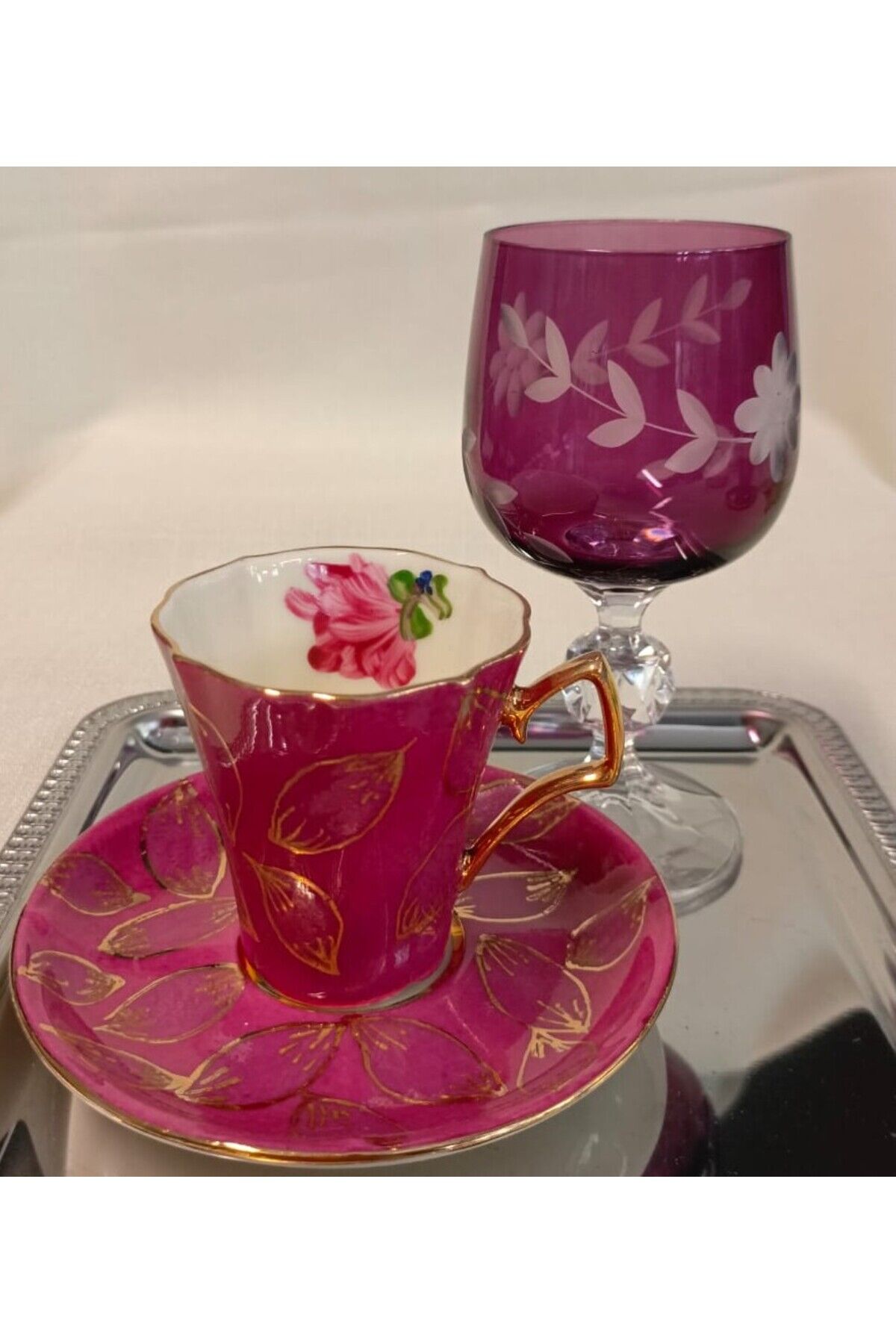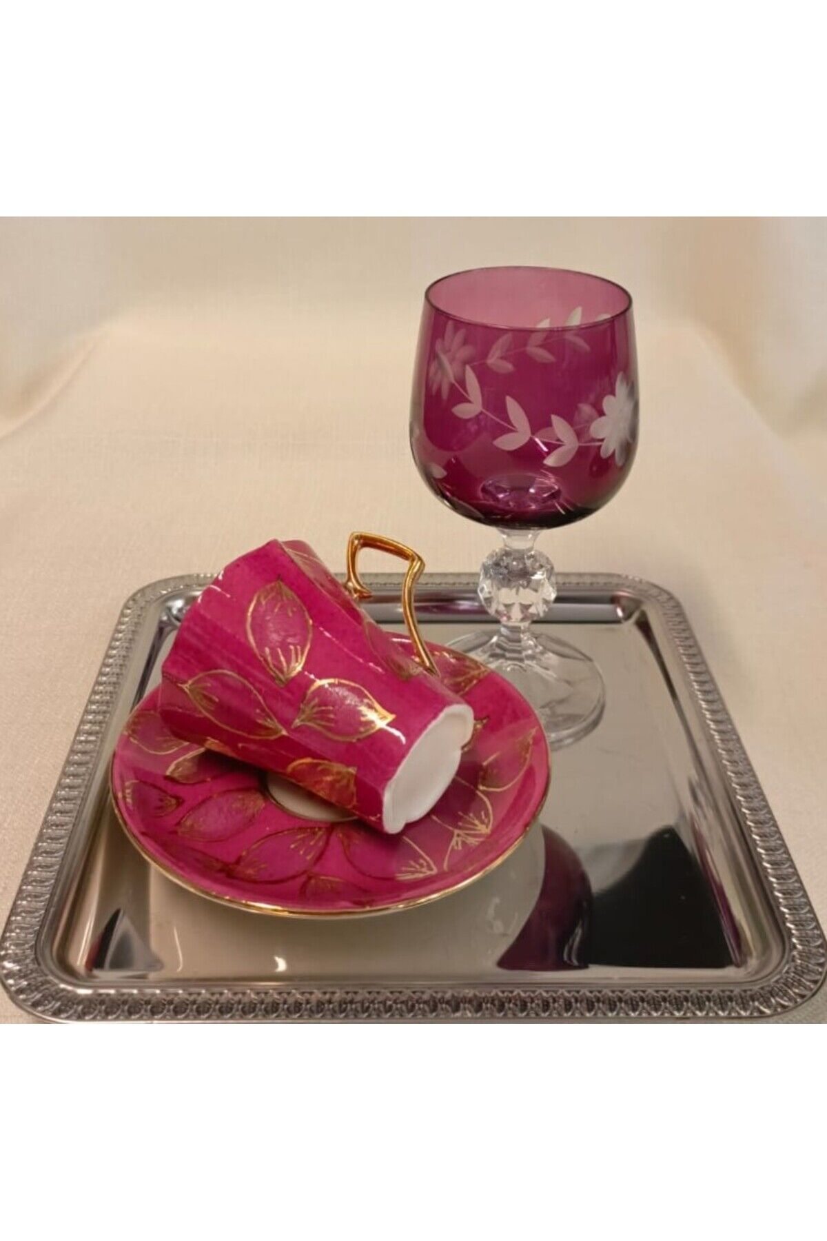 BADEM PORSELEN EL BOYAMA TEK KİŞİLİK KAHVE FİNCANI VE KADEH SU BARDAĞI
