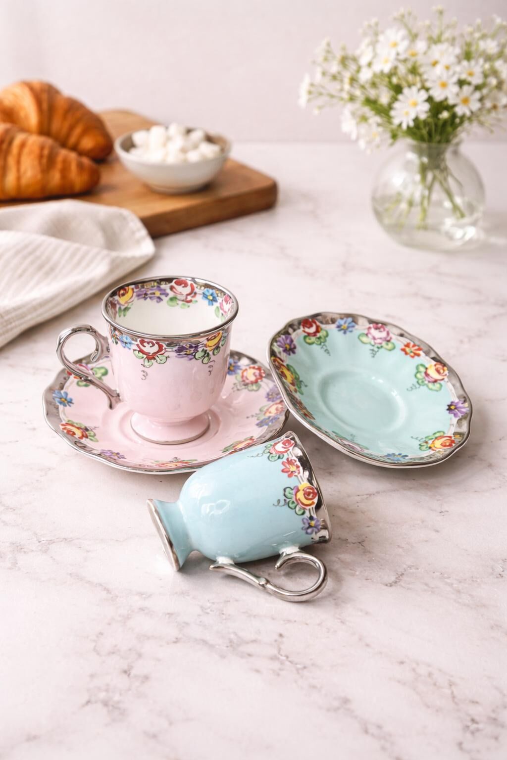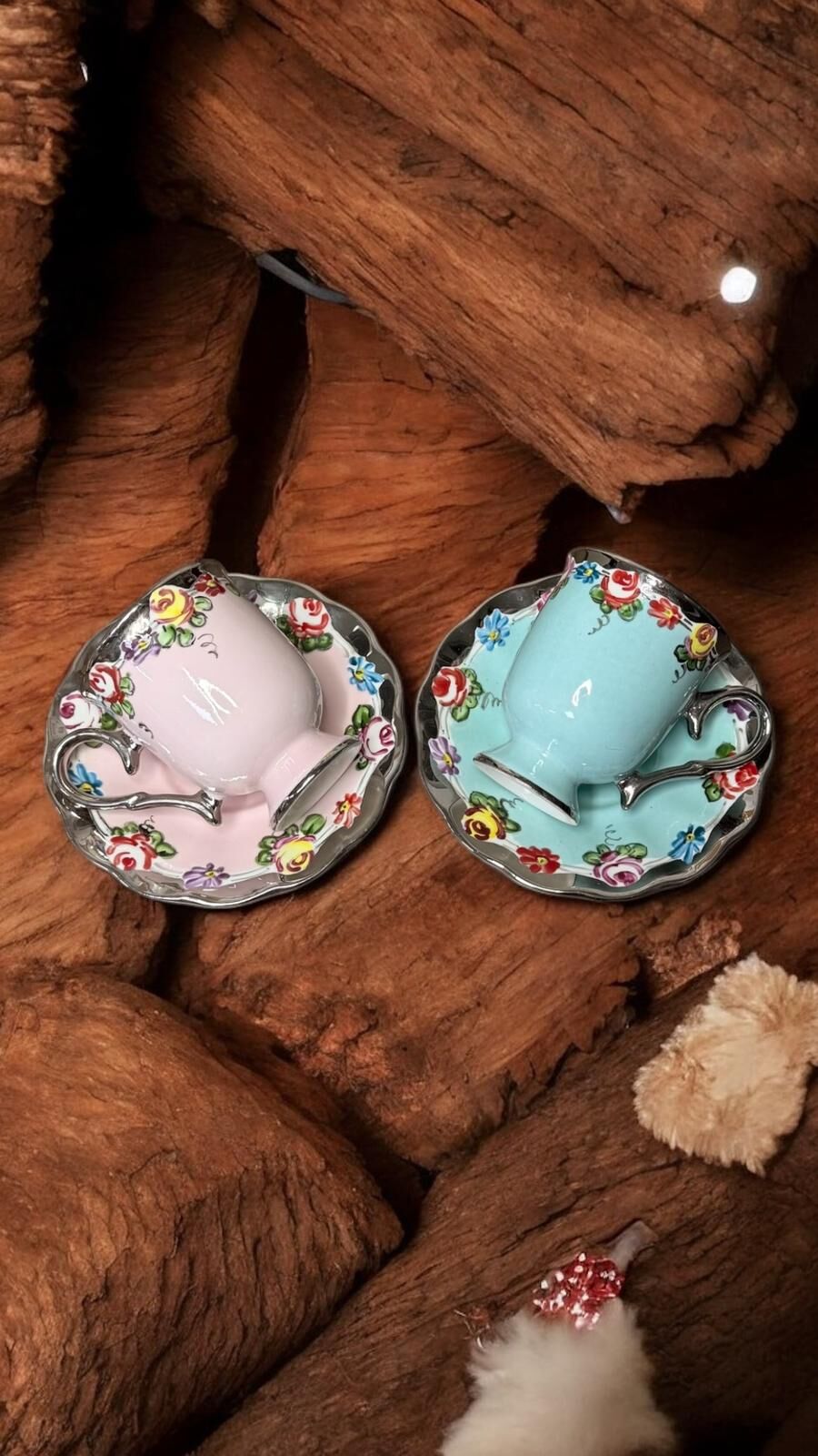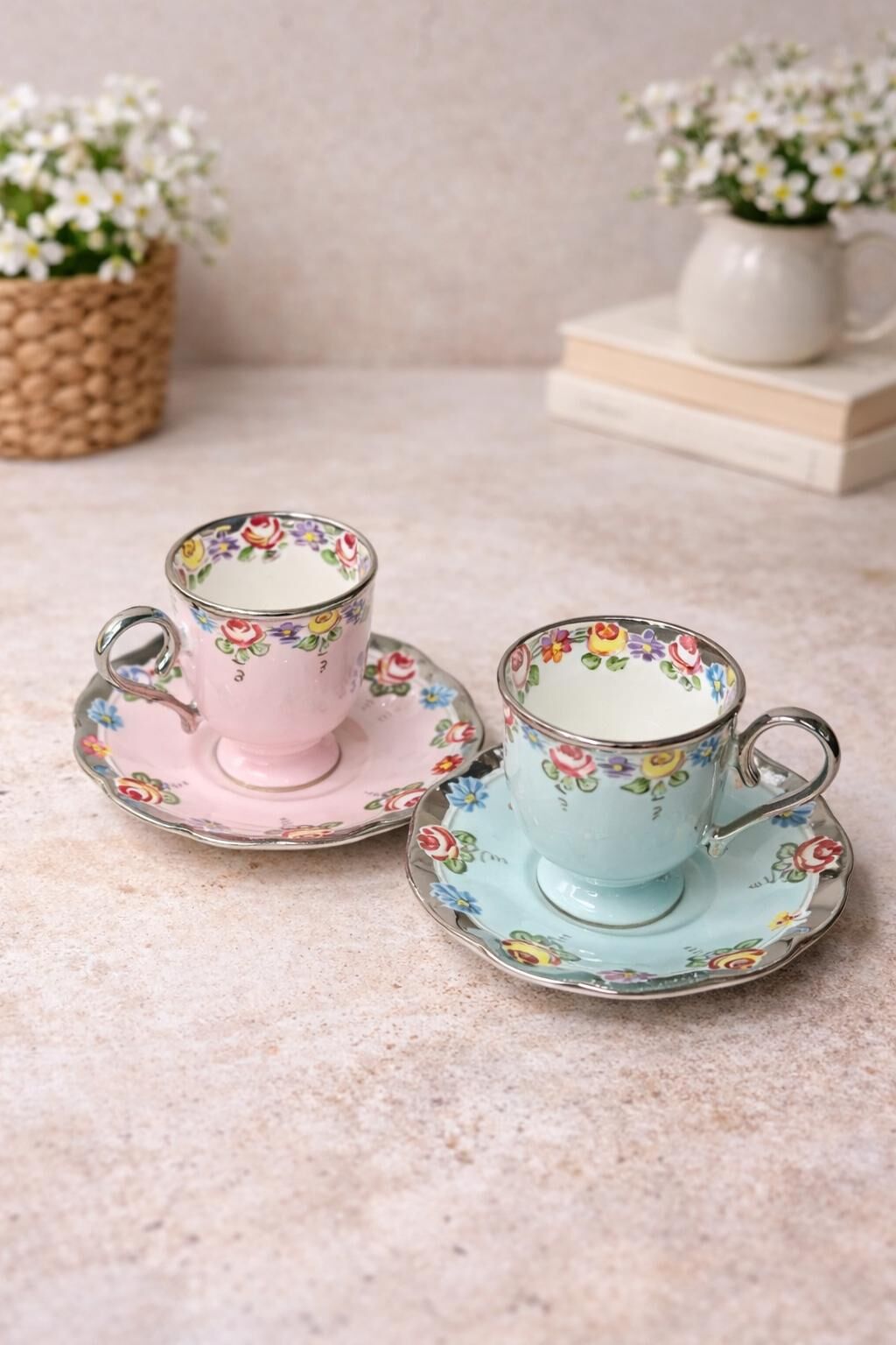 Her biri özenle el boyaması olan bu fincanlar, benzersiz desenleriyle sofralarınıza estetik bir dokunuş sunar. Gümüş detaylarının uzun ömürlü kalabilmesi için elde yıkama önerilir.