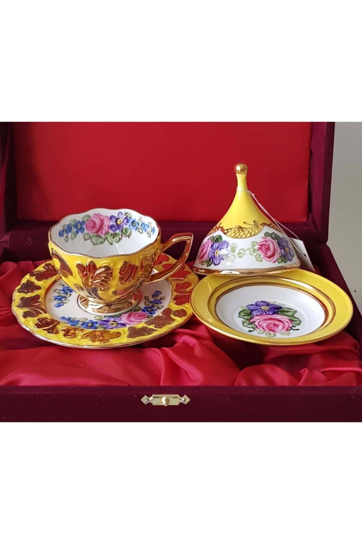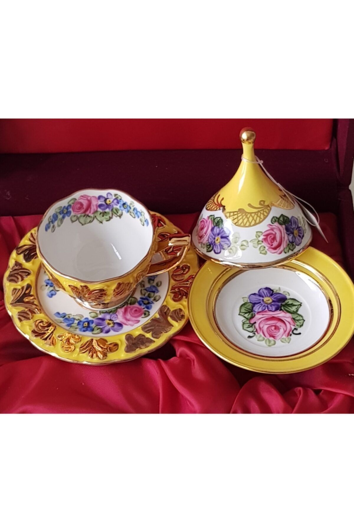 Modern tasarımıyla dikkat çeken bu el boyama fincan ve lokumluk seti, kahve keyfinizi şık bir dokunuşla tamamlar; Tek kişilik kullanım için ideal olan bu set, kişisel kullanımınıza özel bir deneyim sunar; Yüksek kaliteli porselen materyali sayesinde uzun ömürlü ve dayanıklı bir kullanım vaat eder;