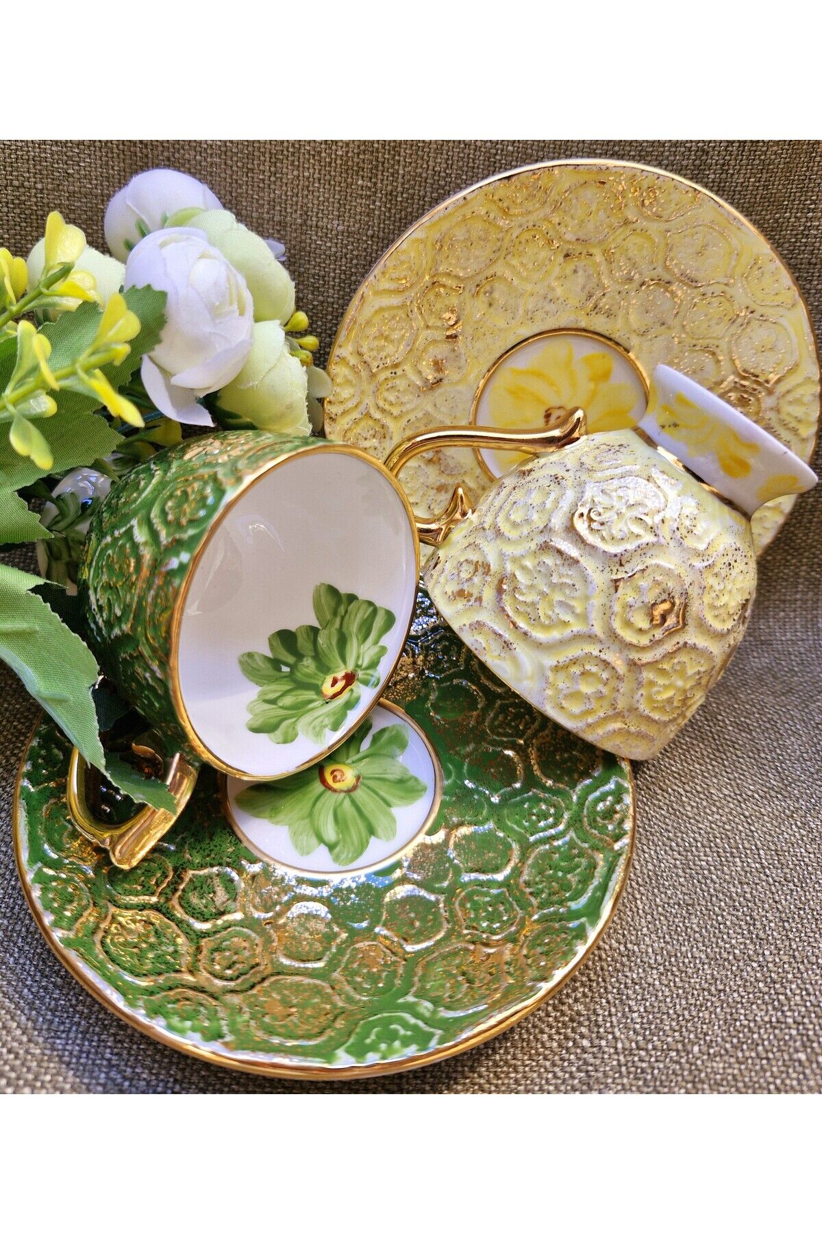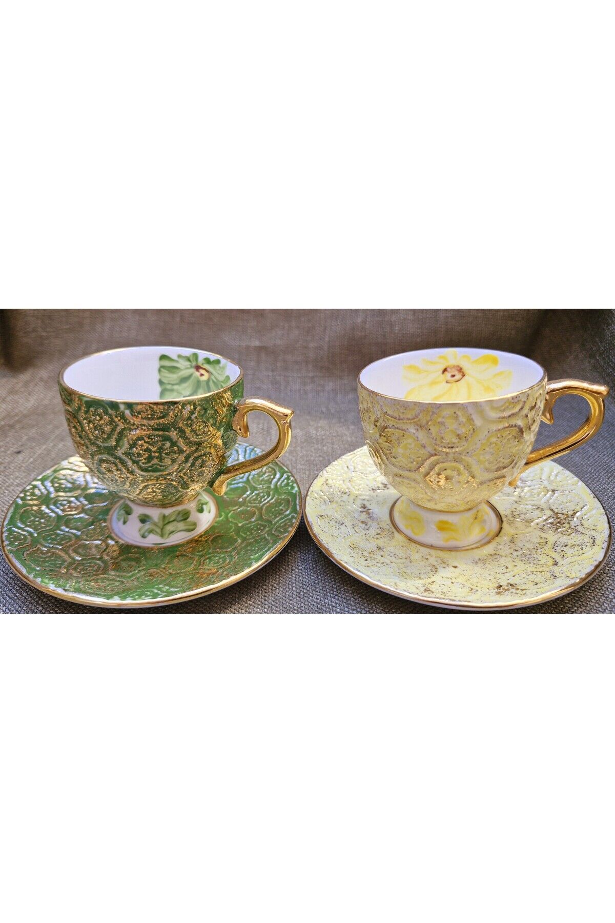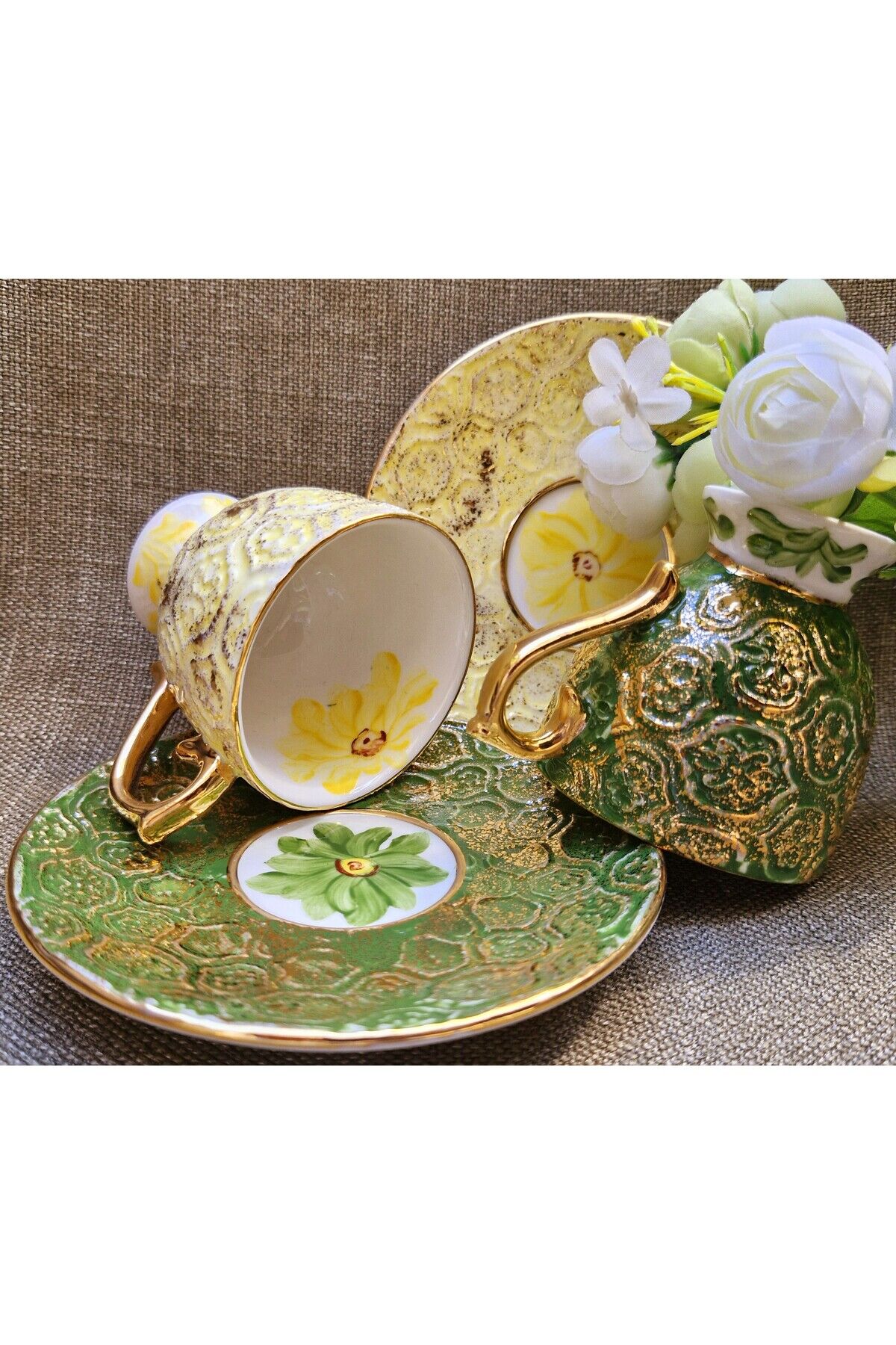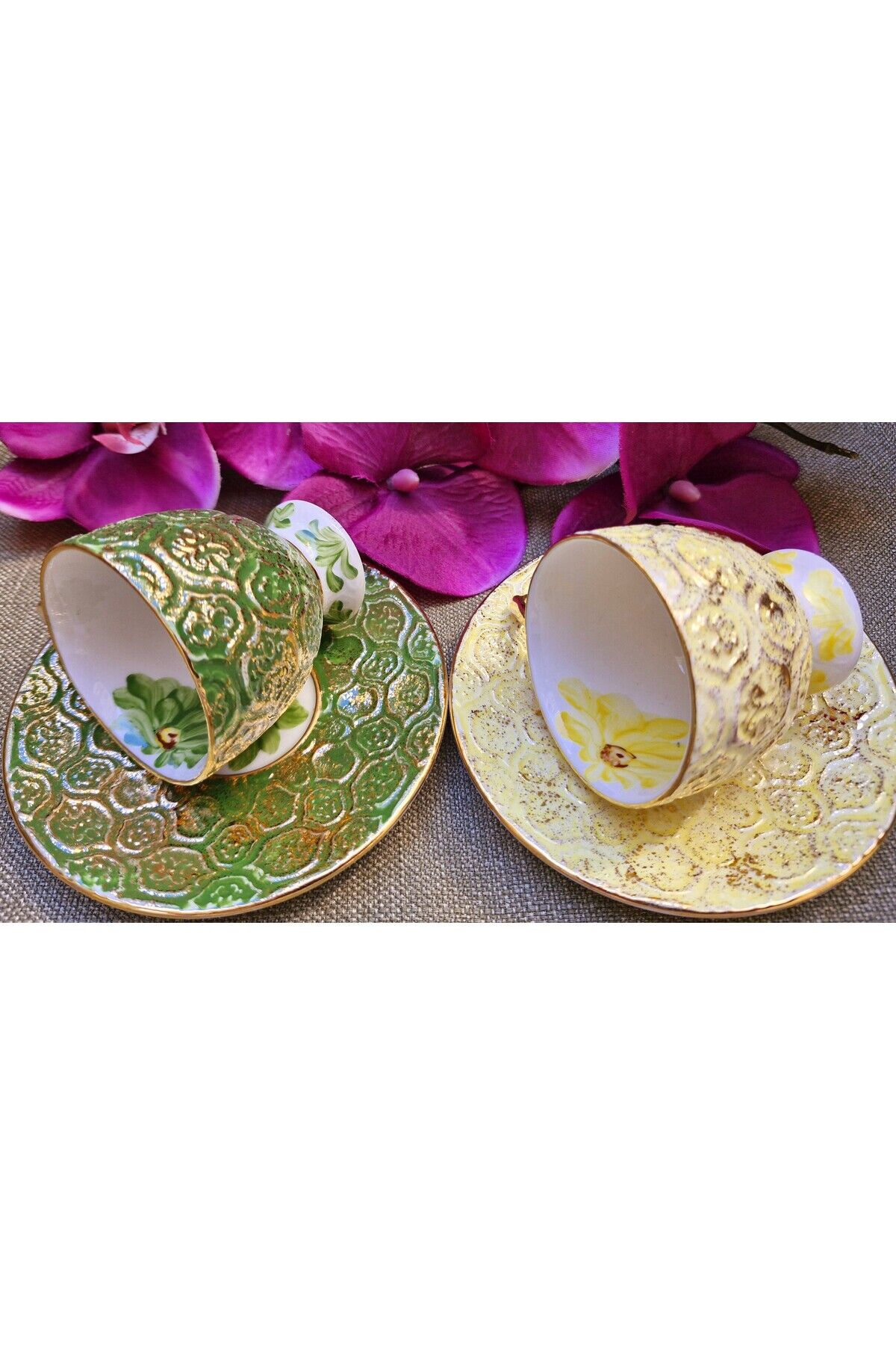 Eskitme Porselen El Boyama 2li Kahve Fincan Takımı