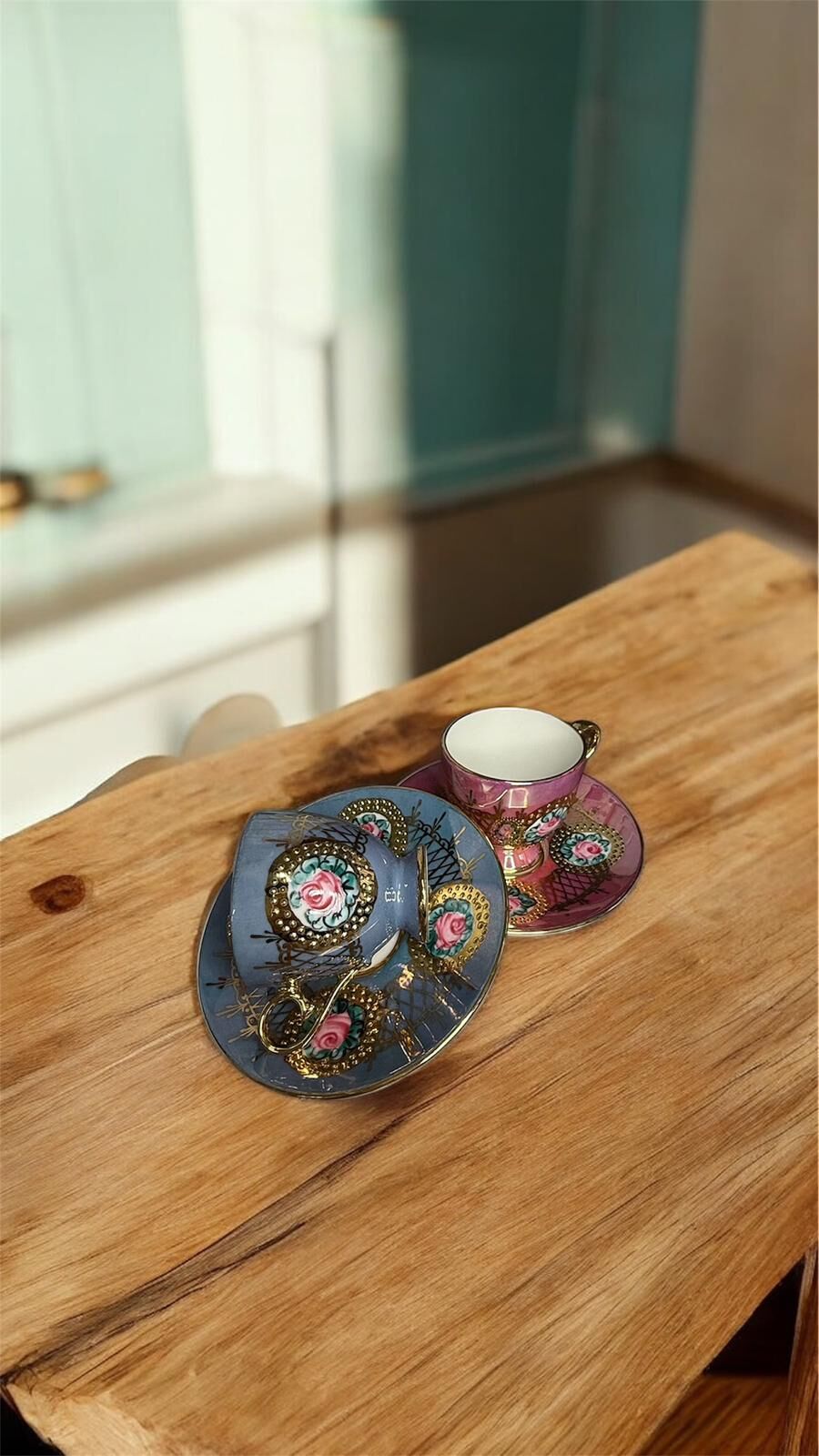 Porselen fincan el boyama tekniğiyle boyanmış olup altın yaldız detaylarla süslenmiştir Türk kahvesi sunumu için ideal ölçüdedir Günlük kullanımın yanı sıra misafirlik kahve ikramları için de tercih edilebilir