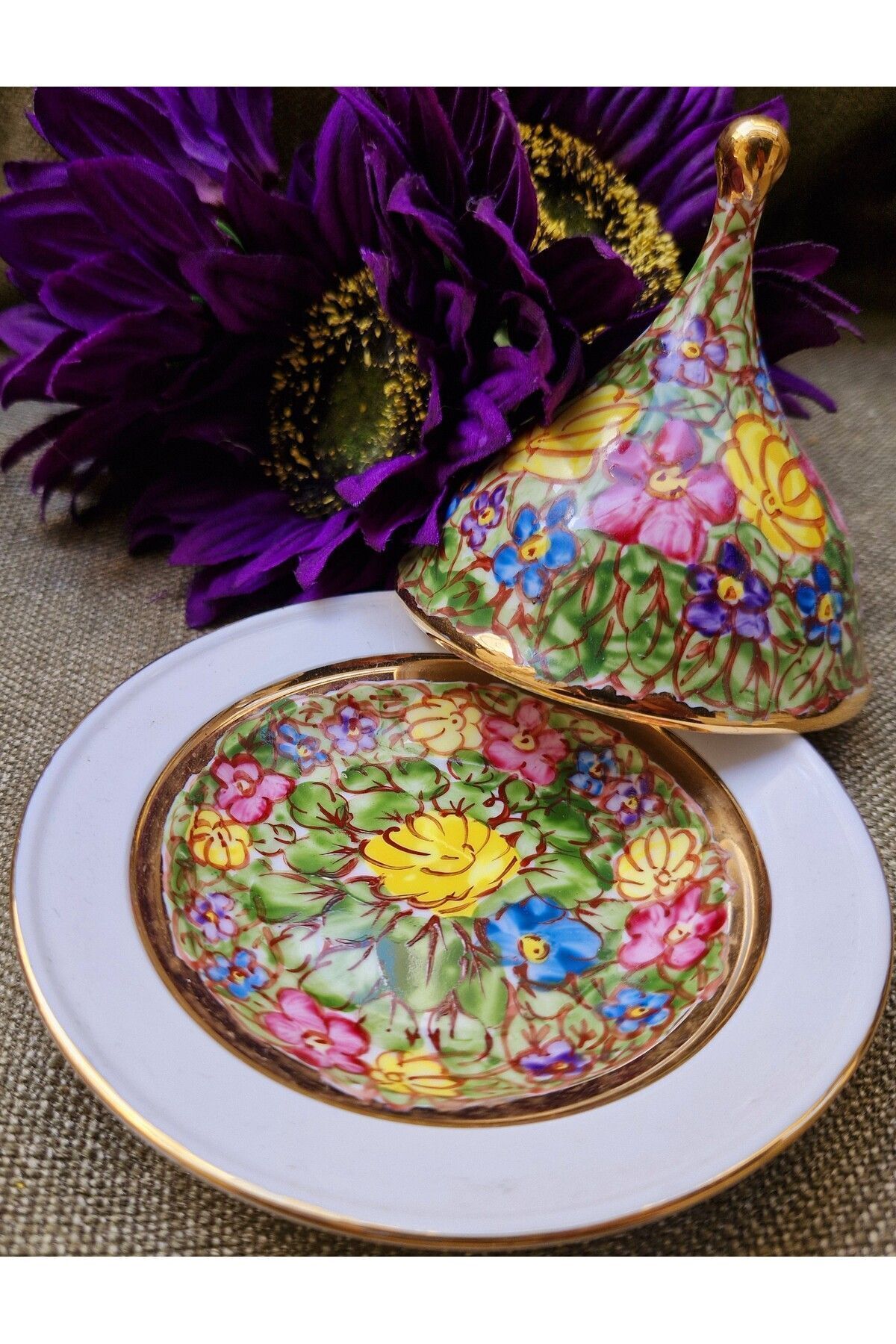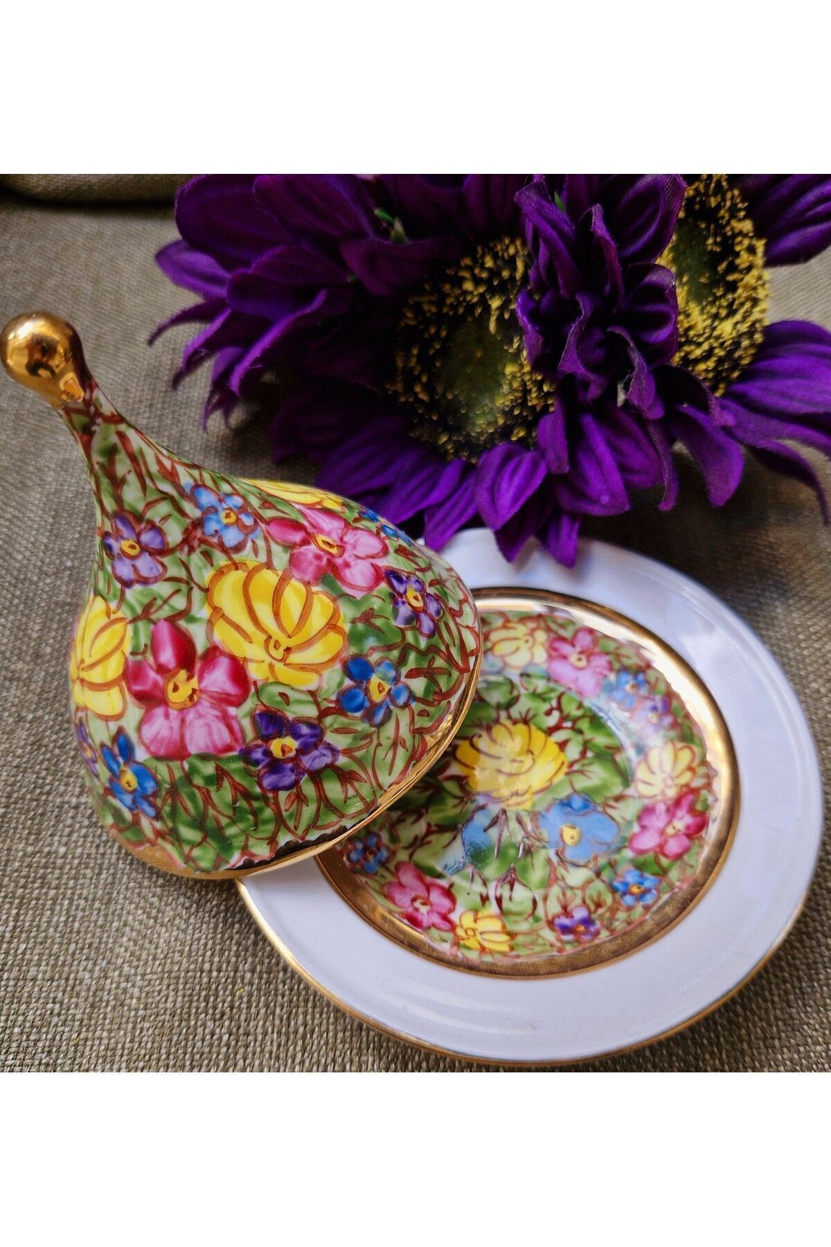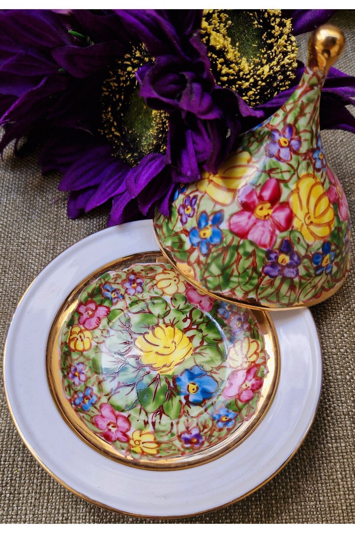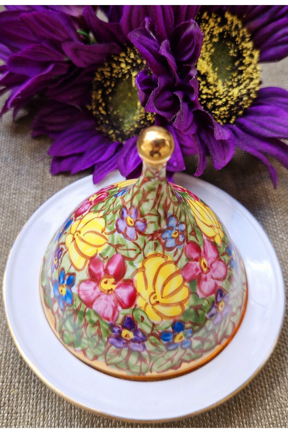 PORSELEN EL BOYAMA 10 CM ÇAPINDA 1 ADET LOKUMLUK VE KAPAĞI ÜRÜNLERİMİZ SANATÇILARIMIZ TARAFINDAN TAMAMEN ELDE BOYANMIŞ OLUP 24AYAR ALTINLA ZENGİNLEŞMİŞTİR BULAŞIK MAKİNASINA GİRER ANCAK DAHA UZUN ÖMÜRLÜ OLMASI AÇISINDAN TAVSİYE ETMİYORUZ; KİMYASALLARDAN UZAK TUTUN (ÇAMAŞIRSUYU, KİREÇ SÖKÜCÜ V; S; );