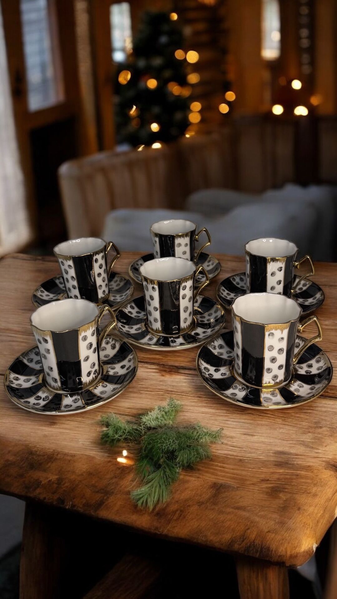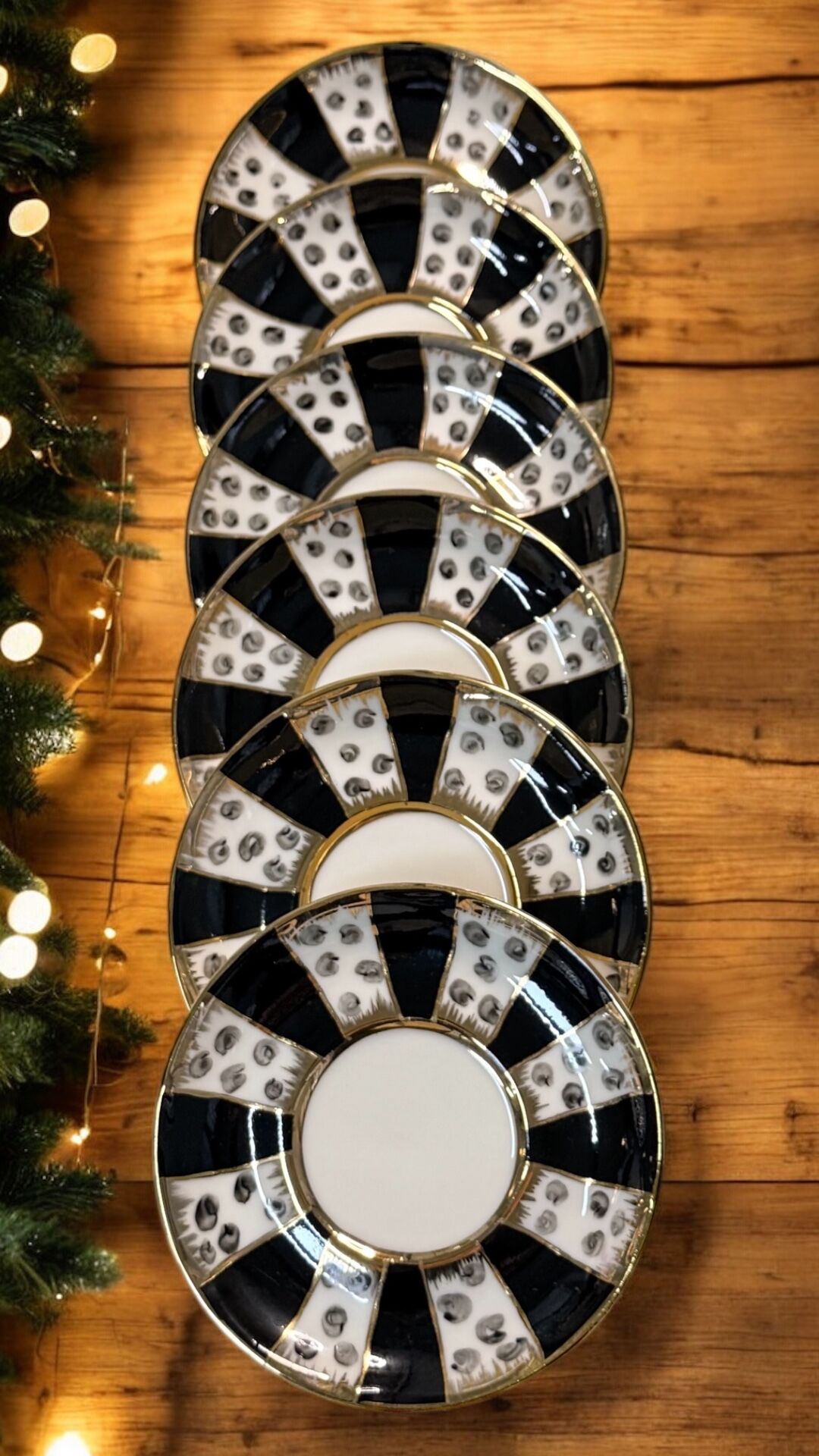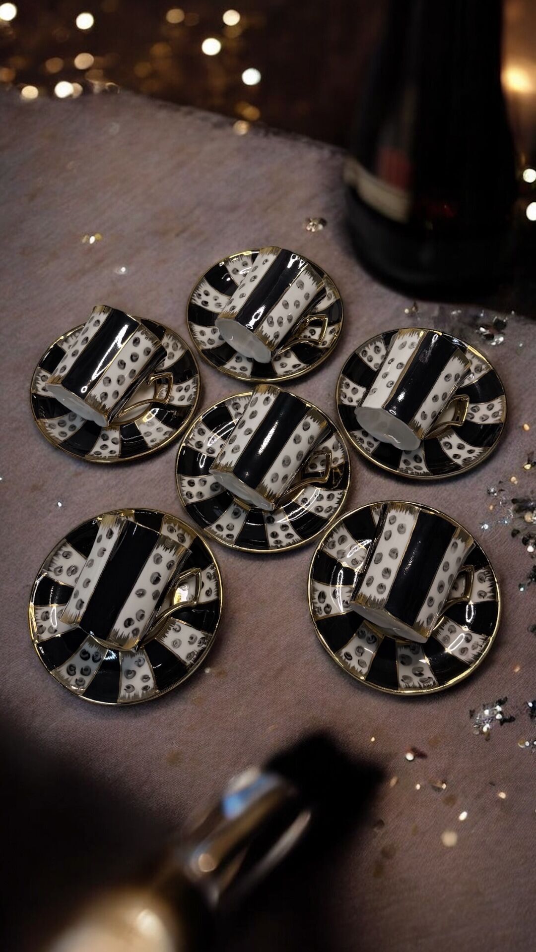 Siyah–beyaz desenleri ve altın kulplarıyla hem klasik hem çağdaş sofralara uyum sağlar.