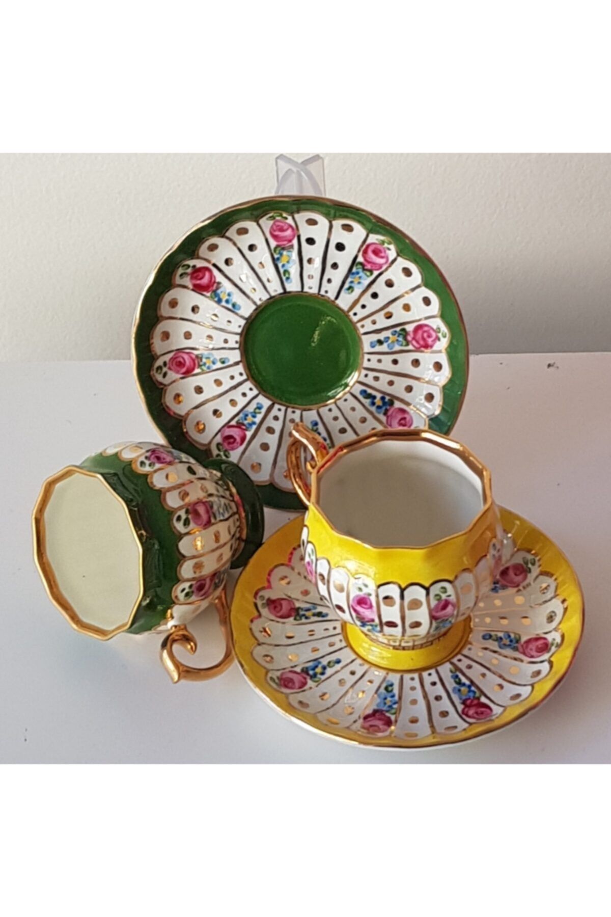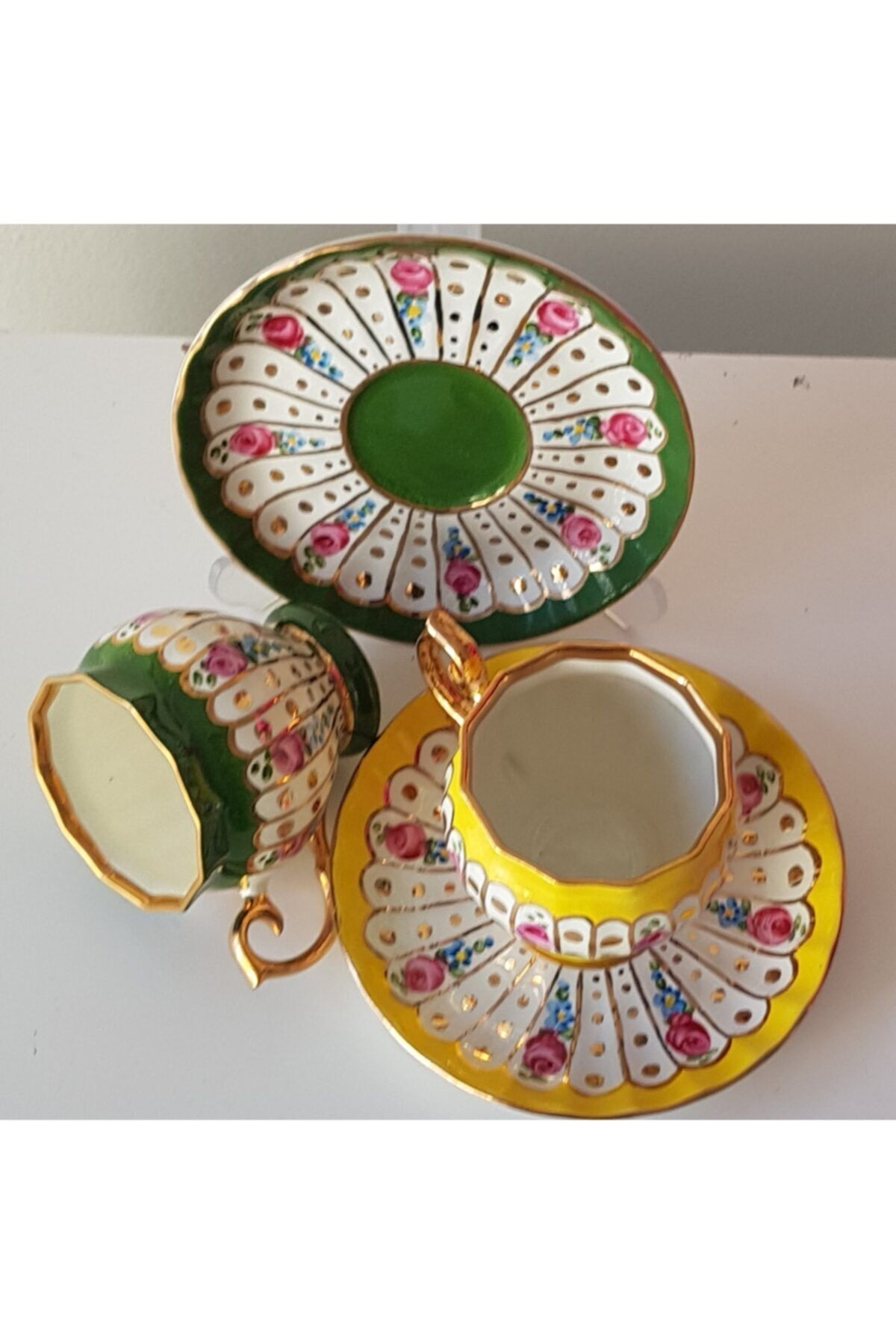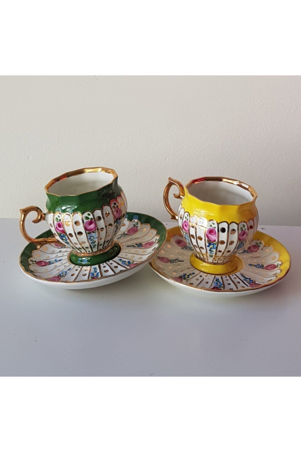 Porselen el boyama buyuk boy ikili kahve fincan seti; Urunlerimiz gunumuzun sanatcilari tarafindan tamamen elde boyanmistir; Yaldiz kisimlari 24 ayar altinla zenginlestirilmistir; El yapimi oldugu icin kusursuz degiller;