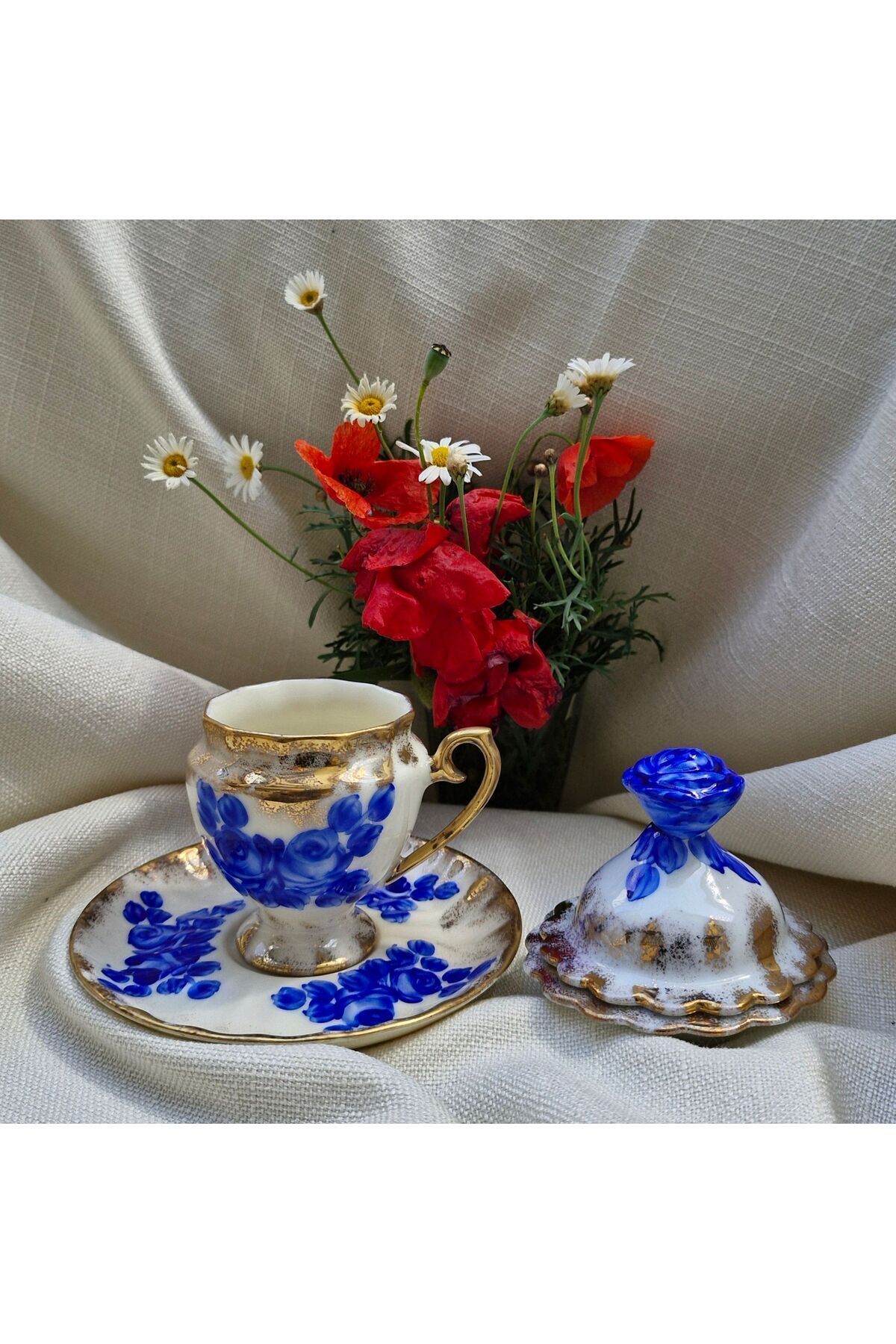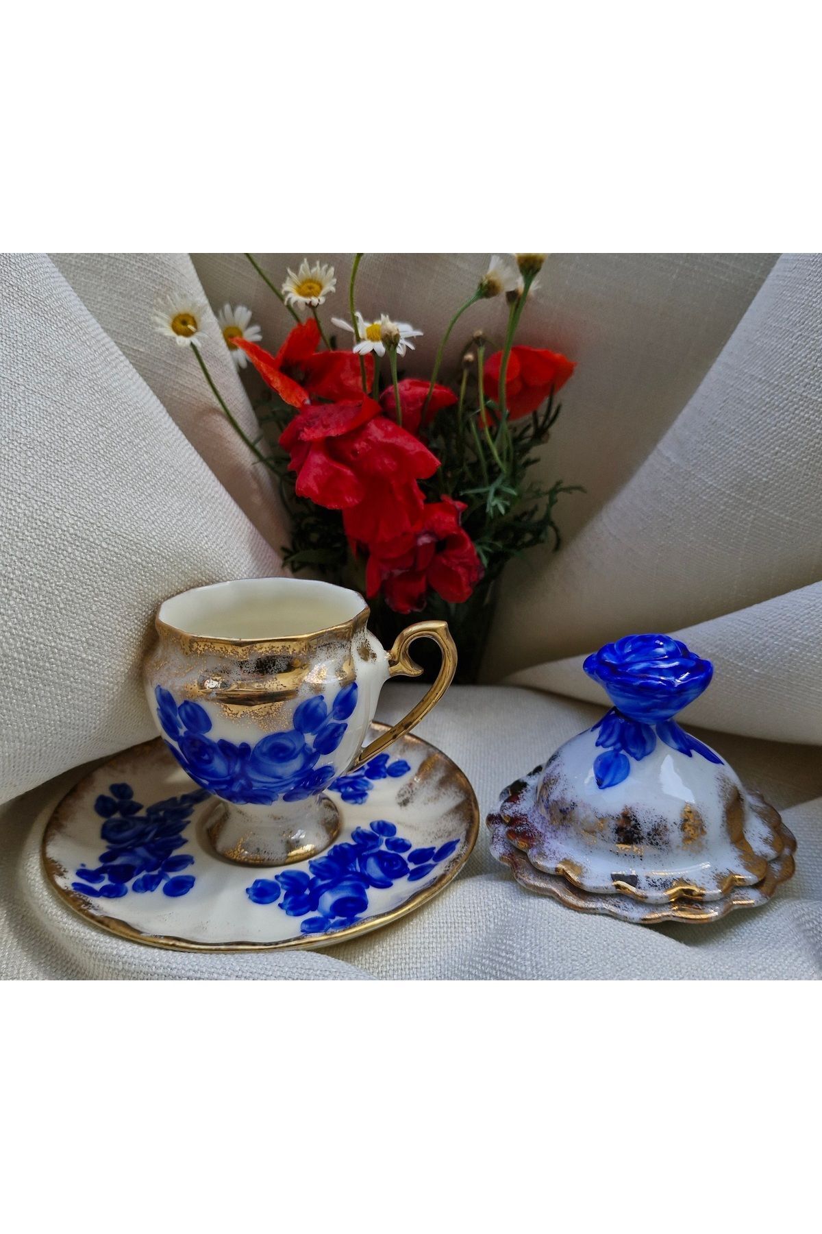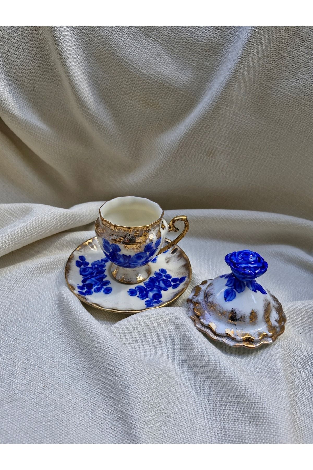 Porselen El Boyaması Mavim Kahve Fincanı Ve Lokumluk