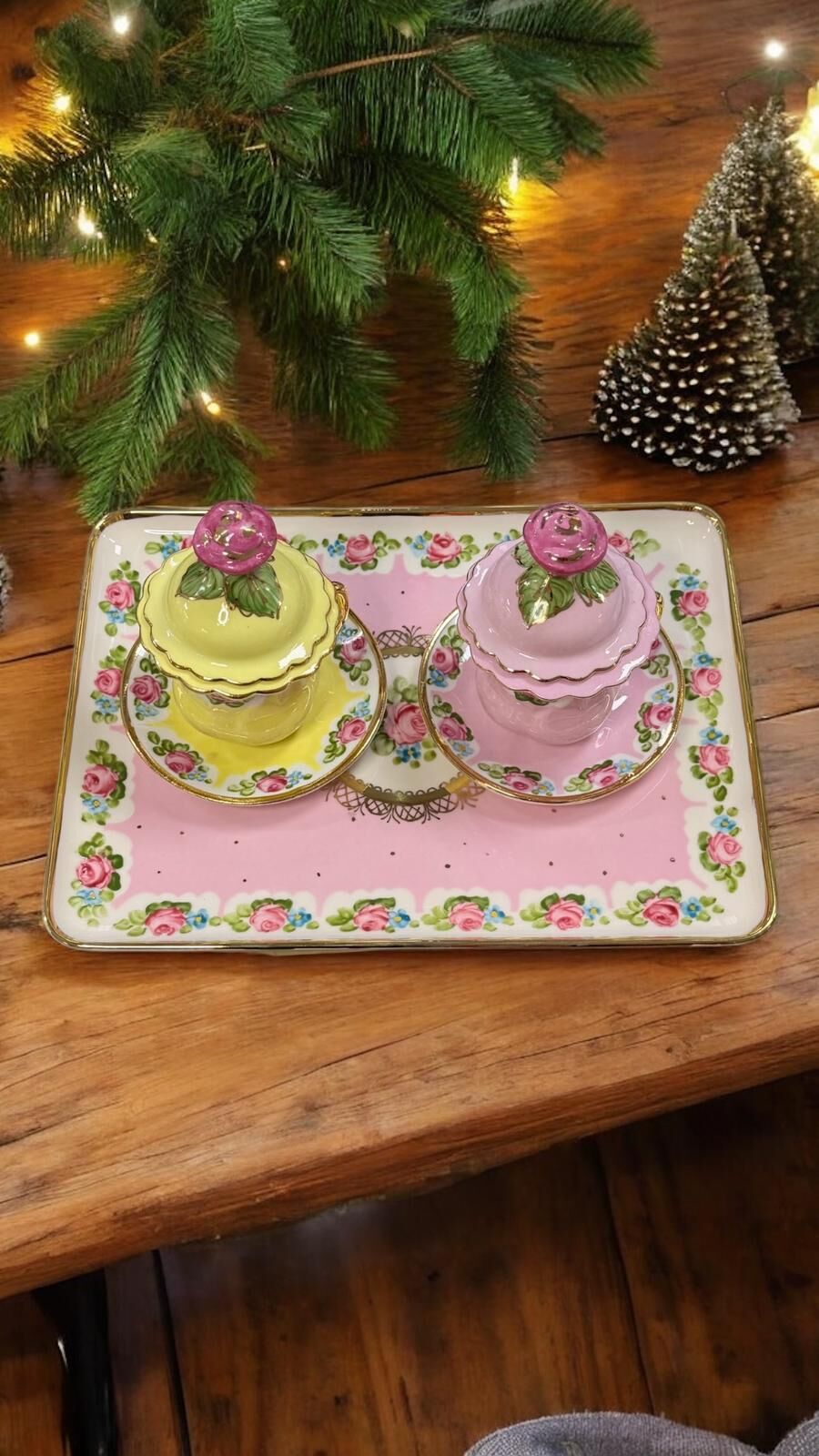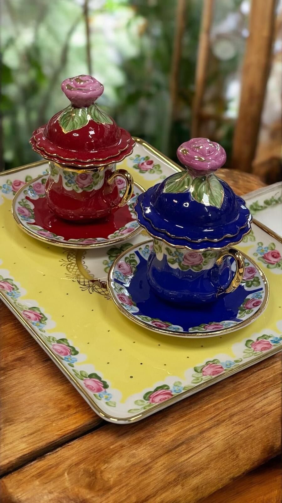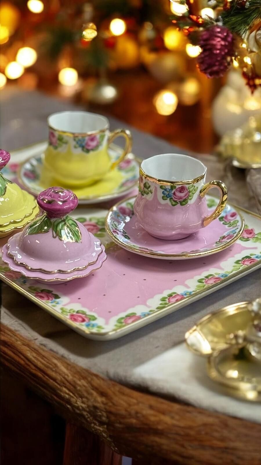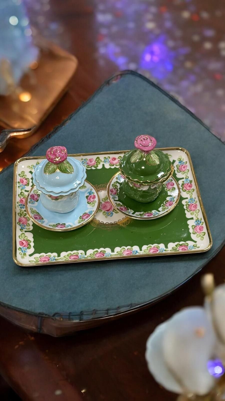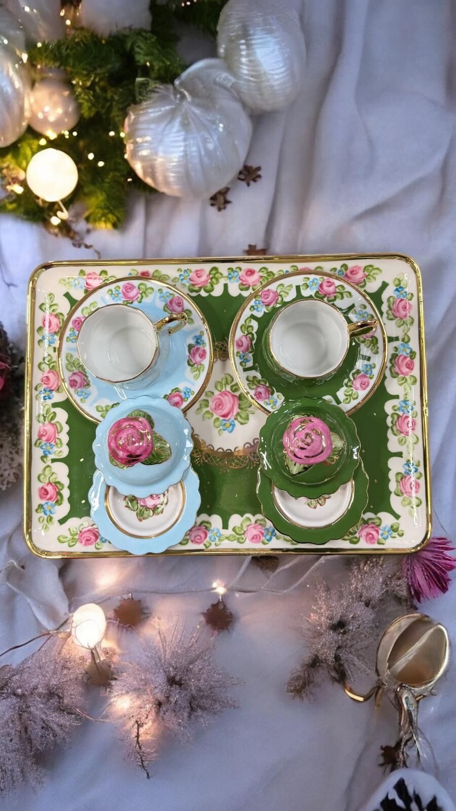 Zarafetin ve geleneksel şıklığın buluştuğu Saray seti; el boyama porselen tepsisi, kapaklı lokumlukları ve uyumlu kahve fincanlarıyla özel sunumlar için tasarlandı. Pastel tonları, gül motifleri ve altın yaldız detaylarıyla sofralarınıza saray şıklığı katar.