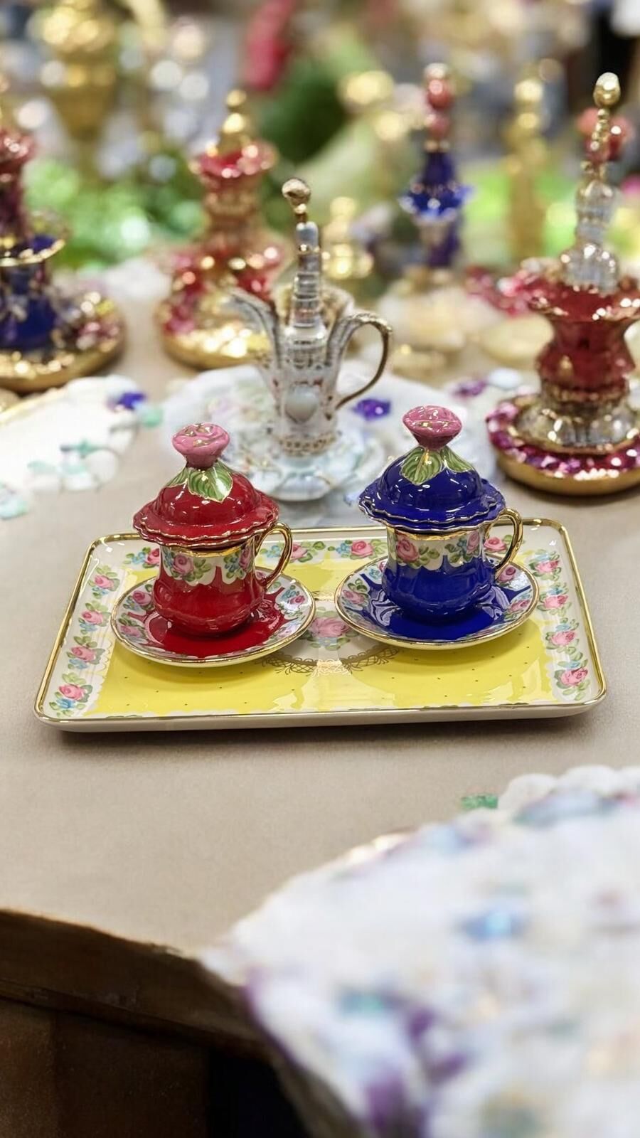 • Tepsi + kapaklı lokumluklar + kahve fincanları