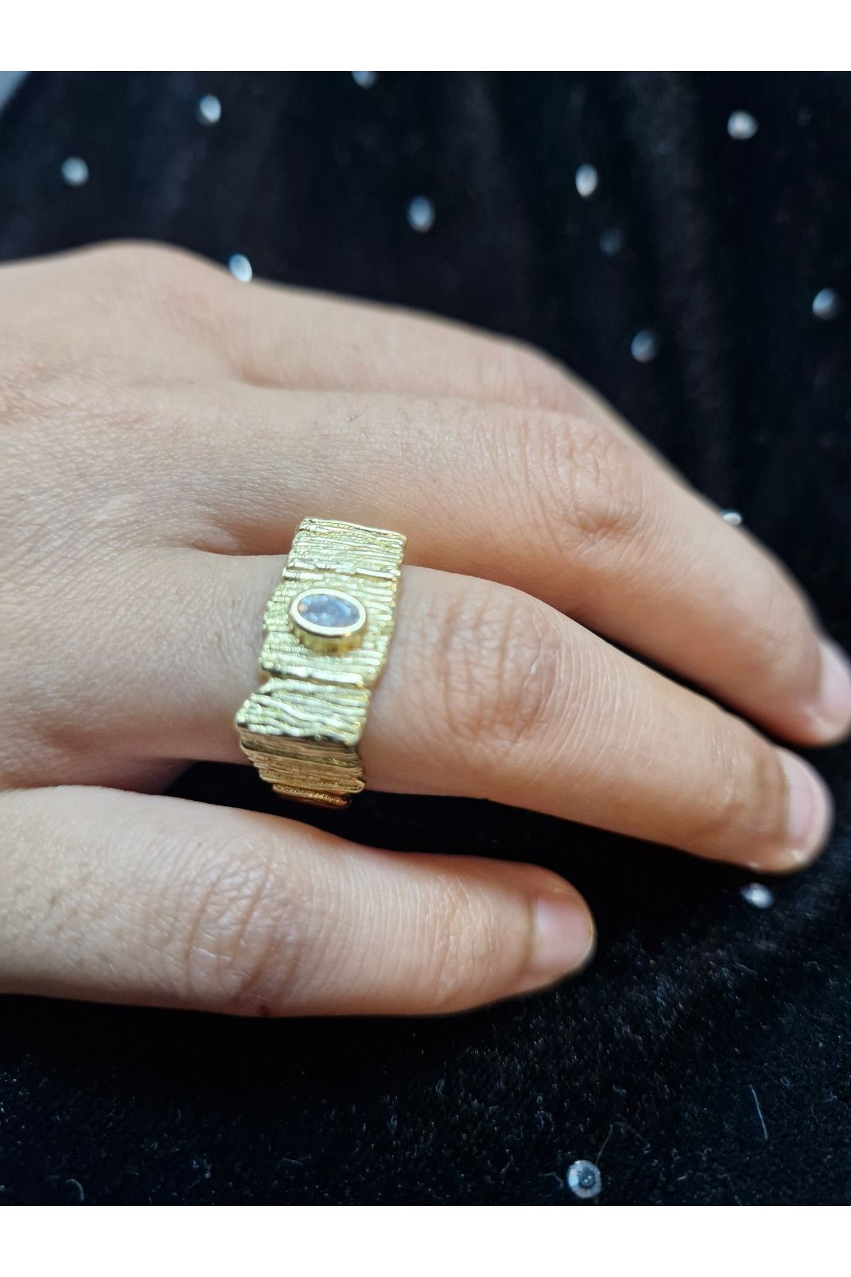 TAKI ÖZEL TASARIM ALTIN KAPLAMA ZİRKON TAŞLI DÖVGÜLÜ AYARLANABİLİR KARE FORMLU YÜZÜK