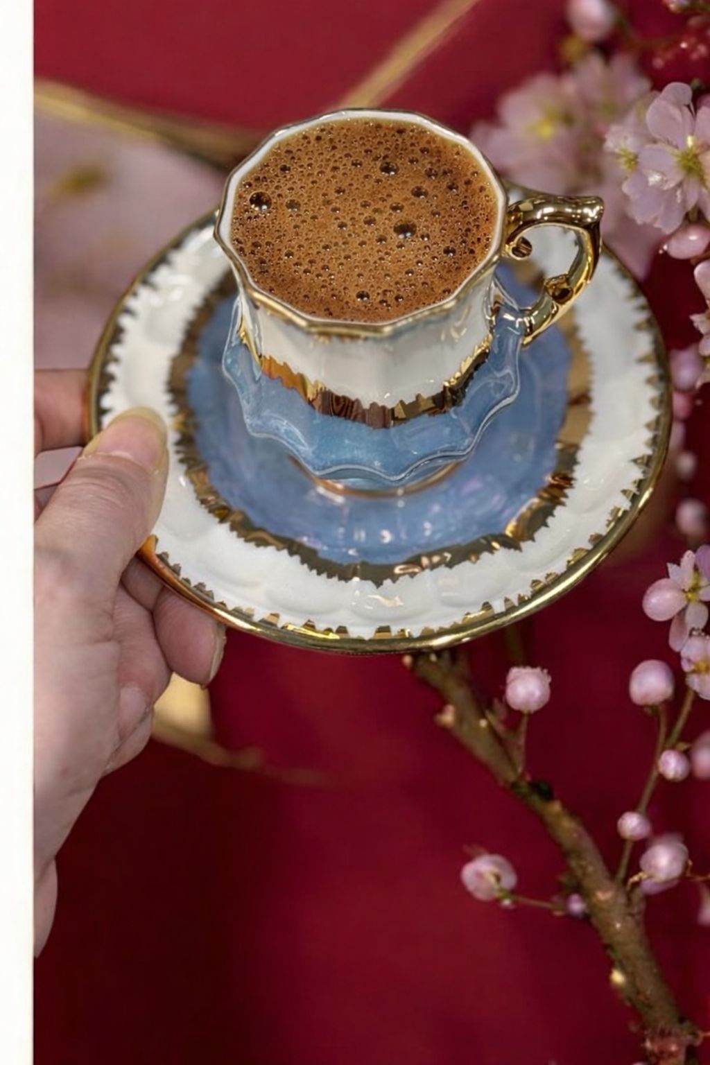 El boyaması ve altın işlemeli detaylarıyla şık bir tasarıma sahiptir. Her parça el emeği olduğu için kendine özgüdür. Türk kahvesi sunumları ve misafir ağırlamak için idealdir. Uzun ömürlü kullanım için elde yıkanması tavsiye edilir.
